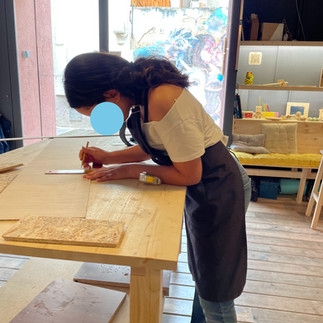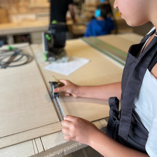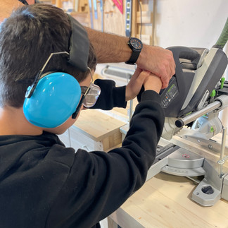 Day 2: The projects began to come to life as we measured, cut, and assembled using manual and power tools and techniques. We used both subtractive and additive techniques like carving bowling pins out of wood or basic wood joinery like butt-joints to build a frame.